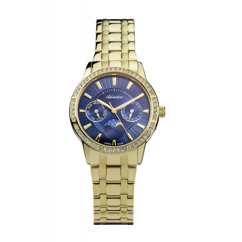 Damski zegarek szwajcarskiej marki Adriatica  o nowoczesnym stylu, będzie świetnym dodatkiem do sportowej jak i eleganckiej stylizacji. Koperta i bransoleta wykonane ze stali szlachetnej pozłacanej metodą PVD w kolorze żółtego złota. Uwagę zwracają kryształy osadzone na bezelu oraz tarcza w kolorze niebieskim.