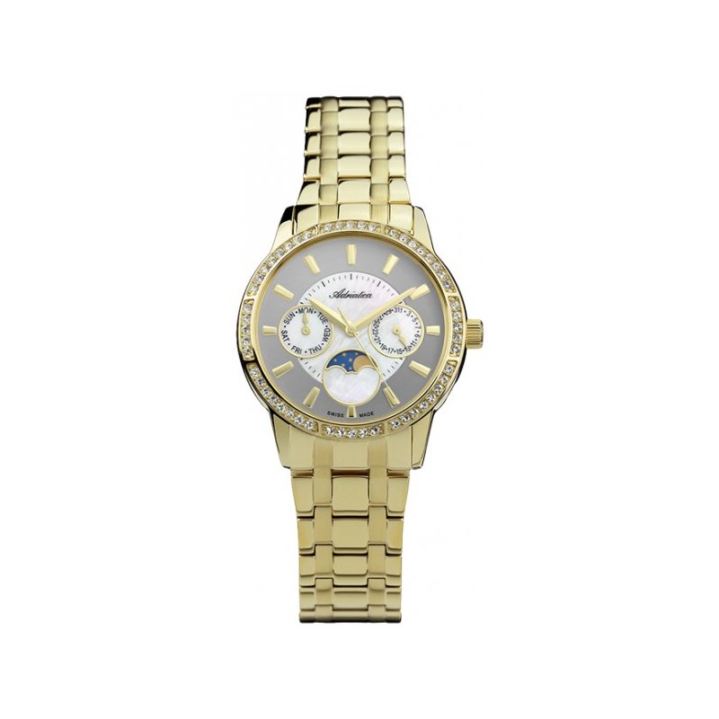 Damski zegarek szwajcarskiej marki Adriatica wykonany ze stali szlachetnej 316 L. pozłocony metodą PVD w kolorze żółtego złota.Wyjątkowy model z rozbudowanym datownikiem oraz wskazaniem faz księżyca. Idealny dodatek do sportowej jak i eleganckiej stylizacji.