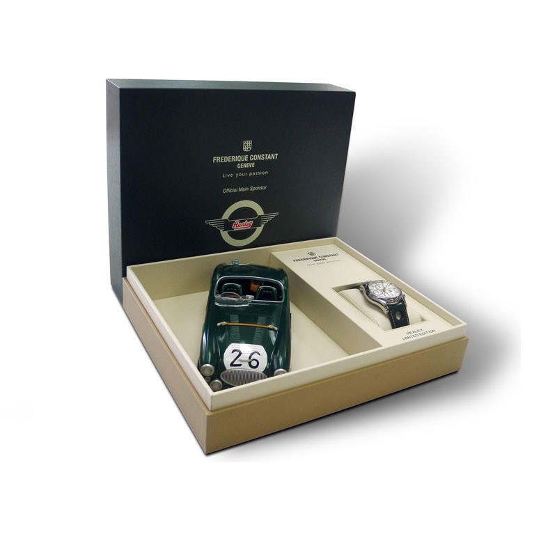 Zegarek męski Frederique Constant Rally Healey wyprodukowany został w limitowanej ilości 1888 sztuk. Model posiada elegancką kopertę, giloszowaną tarczę z logo słynnego samochodu wyścigowego Austin Healey oraz detale zainspirowane zabytkowymi samochodami takie jak indeksy, wskazówki czy charakterystyczny pasek. Wraz z zegarkiem w eleganckim pudełku znajduje się wierna replika tego samochodu.