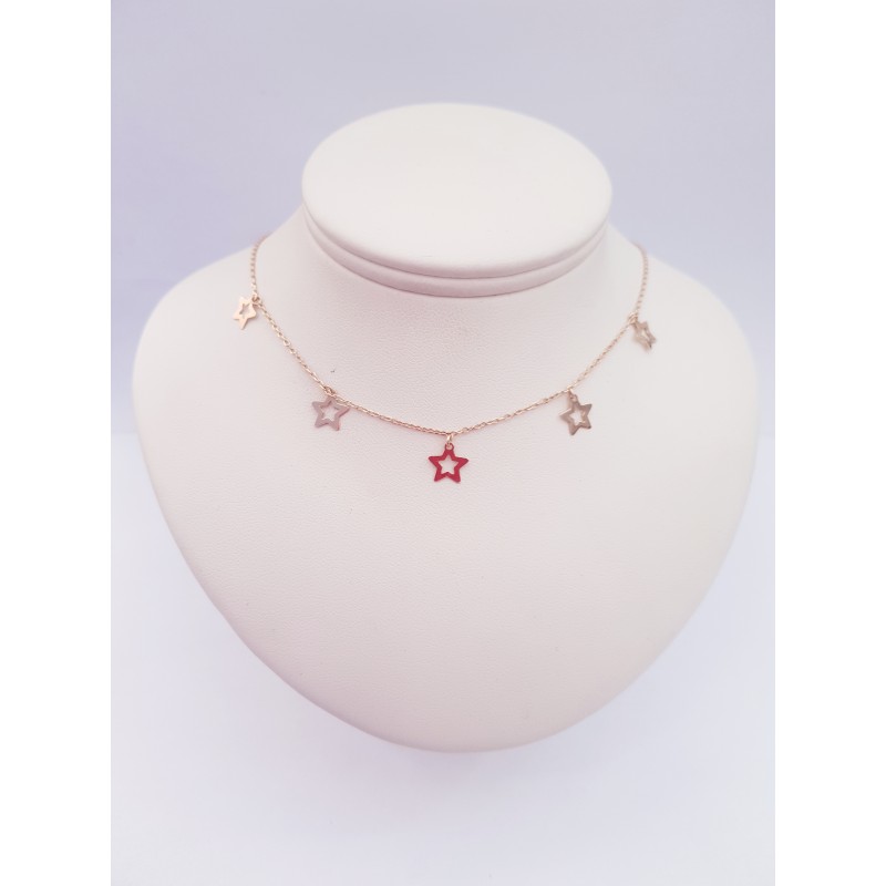 Elegancki złoty naszyjnik wykonany ze złota próby 0,585 z pięcioma zawieszkami -gwiazdkami .Długość naszyjnika wynosi 36 cm plus 6 cm łańcuszka do regulacji długości.