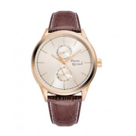 Męski zegarek marki Pierre Ricaud wykonany ze stali szlachetnej. Zegarek wyróżnia szara tarcza z czarnymi indeksami. Całość jest pozłacana metodą PVD w kolorze różowego złota.