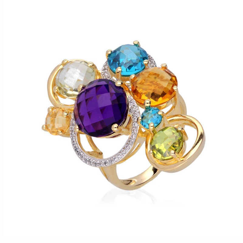 Elegancki pierścionek wykonany z żółtego złota próby 585. Szlachetny kruszec połączono z kamieniami naturalnymi najwyższej jakości. Pierścionek o geometrycznym kształcie zdobią brylanty oraz kolorowe kamienie naturalne o łącznej masie 11,98 ct. Dzięki kamieniom szlachetnym pierścionek zachwyca różnorodnością barw.